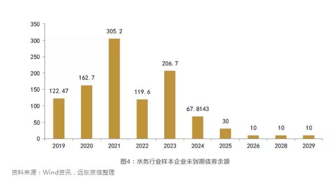 截至2019年7月30日,样本企业存续债券余额共1044.48亿元(图4)。其中,多数债券集中在2021年到期,共305.2亿;其次是2023年,共有206.7亿债券到期。2019年,36家样本企业共有112.47亿债券到期,面临一定的偿债压力和再融资压力。