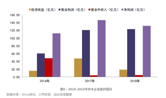投资收益方面,2018年,样本企业实现投资收益合计18.83亿元,较2017年同期减少28.55亿元,投资收益占营业利润的比重为15.30%,同比下降24.16个百分点(图8)。其中,2017年,中国水务投资有限公司因转让子公司股权导致当期投资收益大幅增长,为21亿元,提高了2017年的投资收益。2018年,样本企业投资收益维持增速稳定,最高为重庆市水务资产经营有限公司,投资收益为4.59亿,公司持有西南证券、重庆银行等优质股权的投资收益和理财收益。综合来说,2018年样本企业营业利润仍主要来自主营业务收入。
