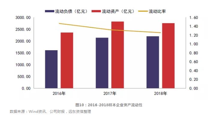从样本企业的负债结构来看,截至2018年底流动负债合计为2196.45亿元,占总负债比重为36.81%;非流动资产为3005.62亿元,占总资产比重为58.95%(图10)。流动比率为1.25,较2017年末下降0.07。债务期限结构略有改善,负债结构总体仍偏长期,面临的再融资和短期偿付压力相对较小。