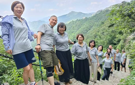 次日早晨,全体集合,一同前往美丽的天台山风景区爬山。队伍沿着石阶缓缓向上,待到登上顶峰,风拂过脸颊,带着山巅的清爽,远处的云海翻涌着与天际相接,脚下的群峰在晨光里若隐若现。这一刻,所有的汗水都成为了最美好的回忆。